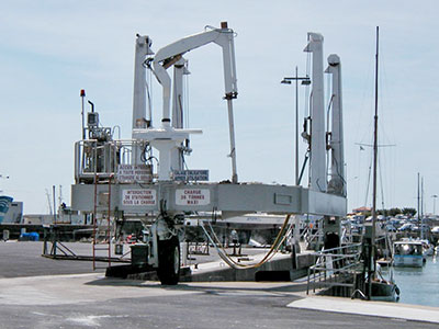 Nous disposons d'un élévateur d'une capacité de 26T muni d'une grue de 1,5T qui se trouve sur l'aire technique de la jetée Est.